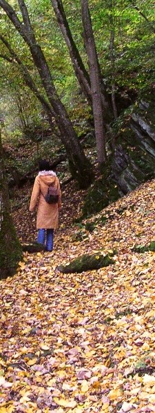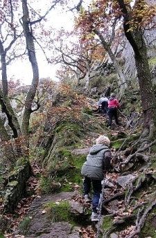 Al snel bevinden we ons in een andere wereld, tussen rotspartijen die hemelwaarts wijzen, oprijzend vanuit een dikke, hellende deken van roestbruin blad. Het is een gekantelde versie van een eikenbos, druk dreigende over te hellen en met een weids gebaar de diepte in te tuimelen. Alleen de bomen, met hun web van wortels, ankeren haar vast aan haar plek. En wij natuurlijk: ons gewicht is in deze doorslaggevend.