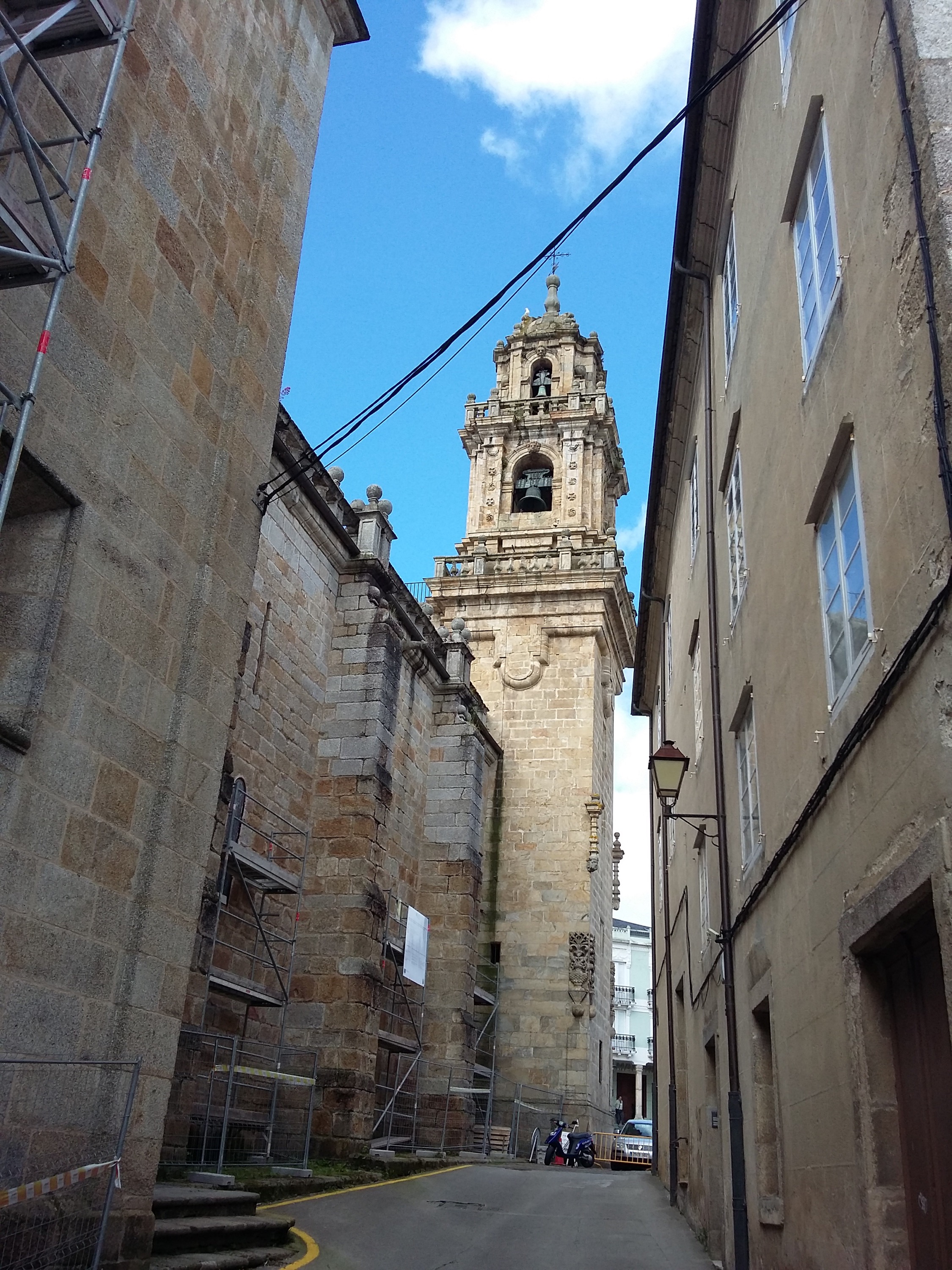 Al rond kwart over 11 drinken we onze café con leche op het plein voor de kathedraal van Mondoñedo, om even later in te checken bij de Hospederia del Seminario de Santa Catalina, een voormalig seminariegebouw dat nu ook dienst doet als hostel. Mondoñedo is het mooiste stadje sinds Santillana, met veel historie en charme. Het doet me wel pijn te zien hoe hard de crisis in dit soort plaatsen huis houdt, met alle leegstaande panden, vervallen straatjes en verpieterende winkeltjes. We doen daarom ons best de middenstand te spekken, en genieten verder van de rust. Morgen gaan we weer de bergen in, 16 km naar Gontan, maar nu mogen de beentjes even rusten!